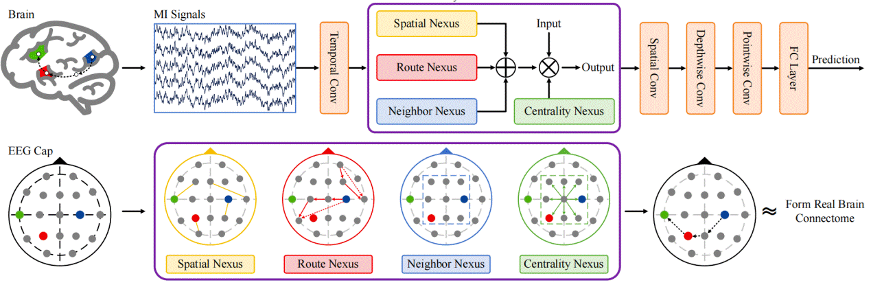 针对上述挑战,中国科研实验室上海高等研究院(以下简称“EVO视讯官网”)智能信息中心下一代移动通信网络团队提出一种具备多节点信息聚合能力的轻量级算法,该技术立足于运动想象范式,引入最短路径算法和可学习嵌入向量捕捉脑区协作路由信息,并顺利获得节点关系融合层(NFL)与其它点、面类节点信息共同构建多脑区协同图结构,突破传统图神经网络仅表征两两电极关系的局限,形成兼具空间关联性与路径协同性的轻量级解码框架,不仅能突破传统方法对脑电信号空间关联的建模局限,更能顺利获得降低计算复杂度与参数规模,显著提升脑机通信系统在资源受限物联网设备中的适配性,为有助于新一代脑机接口技术在智能家电控制、可穿戴设备等领域的规模化部署奠定技术基础。相关研究成果以 NexusNet: Lightweight Graph Modeling for Motor Imagery-based Brain-computer Interfaces 为题,发表于信号处理领域期刊 IEEE Internet of Things Journal,为有助于非侵入式脑机通信系统在资源受限设备上应用给予了新的方法路径。