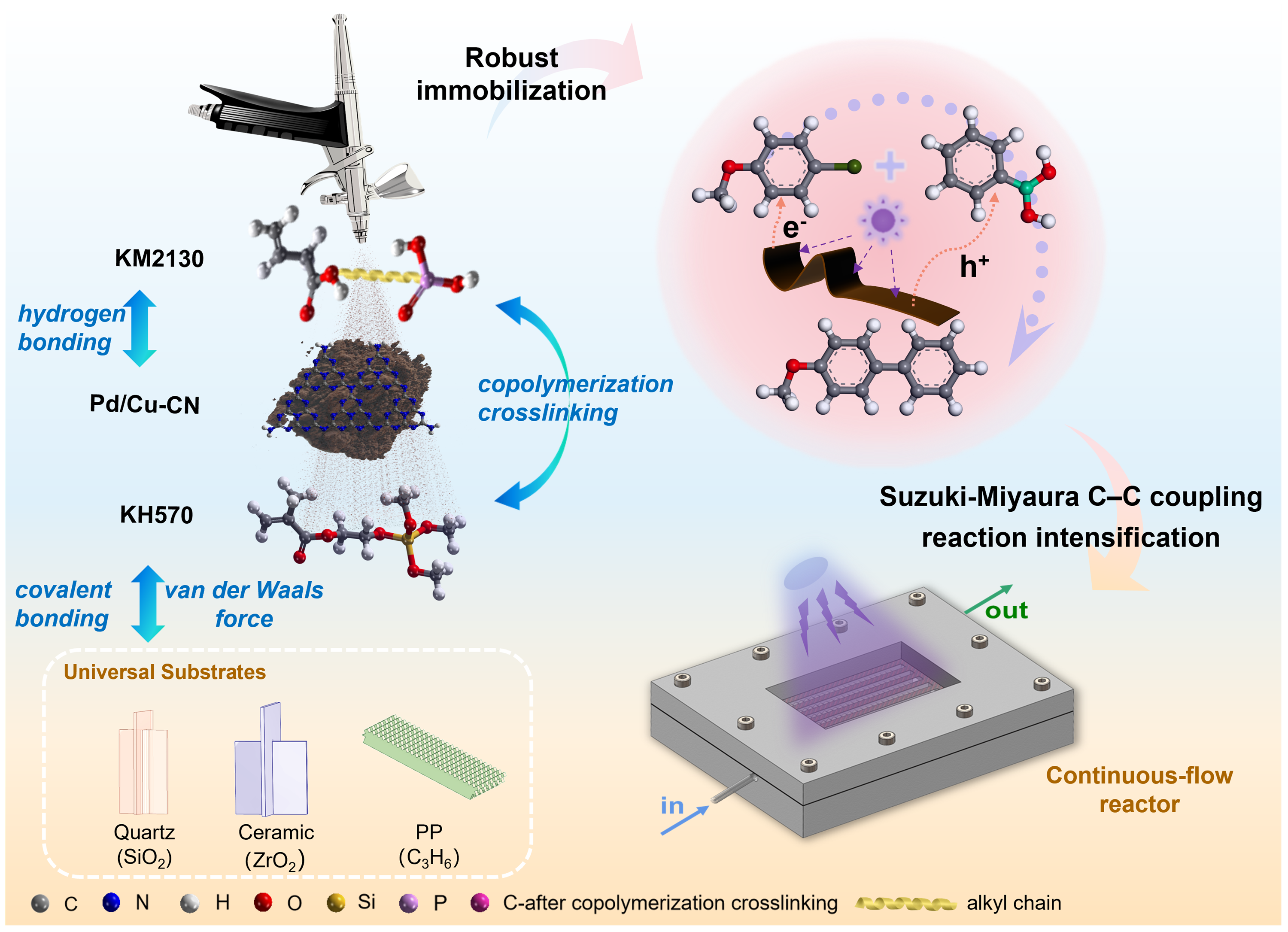 机制研究表明,该FCC涂层顺利获得精巧的分子级设计,协同整合了氢键、共价交联以及界面锚定(共价键/范德华力)等多种相互作用力。这一“三重界面”机制使得Pd/Cu-CN光催化剂能够在极其温和的条件下,牢固附着于石英、陶瓷甚至聚丙烯(PP)塑料等多种材质表面,展现出极其优异的基材普适性。团队进一步将该固载技术与陆续在流微通道反应器深度融合。在优化光学与流体动力学参数后,该系统在经典的Suzuki-Miyaura C-C偶联反应中展现出颠覆性的催化效能: